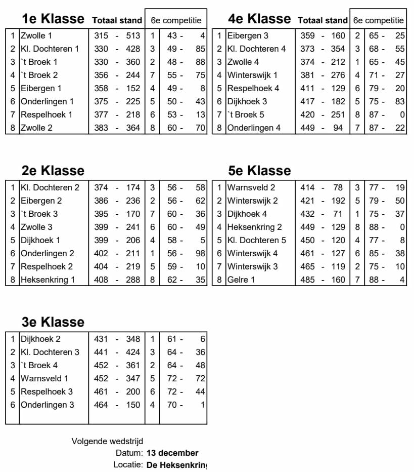 Het is tijd om de tussenstand op te maken na de zesde van de twaalf competities. Dit jaar nog 1 competitiewedstrijd te gaan dit kalenderjaar, toch is dit het moment om terug te kijken, maar toch vooral vooruit. Terug naar afgelopen wedstrijd. Het altijd spannende parkoers in Dijkhoek liet ook deze keer zien dat het kan zorgen voor spanning. In vele klasses waren de verschillen klein, veel kleiner dan normaal.